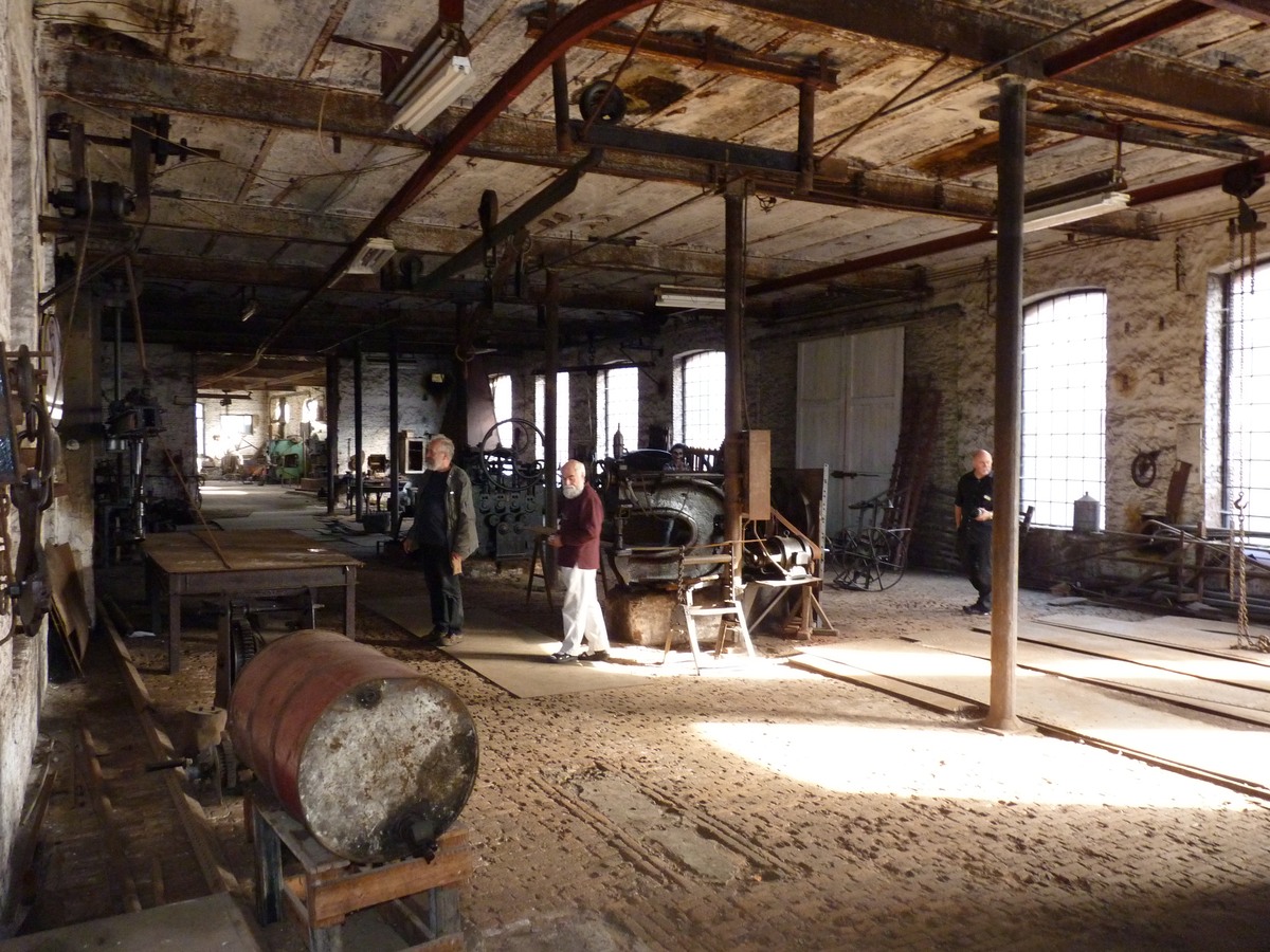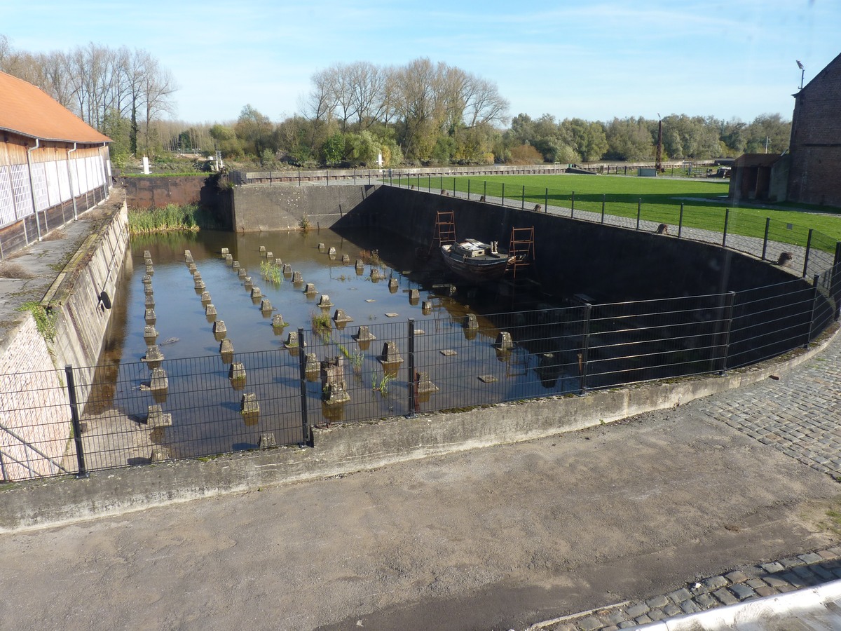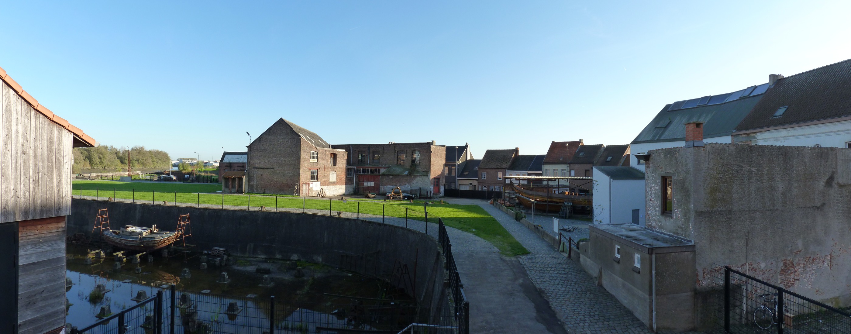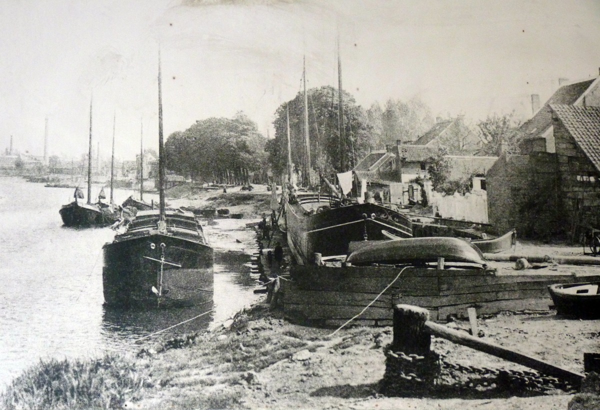Op de achtergrond ziet men het herenhuis van Van Damme. Links daarvan de nieuwbouw, waarin een groot deel van de museumcollectie geherbergd is. Daarnaast ziet men de botter Rosalie in aanbouw. [