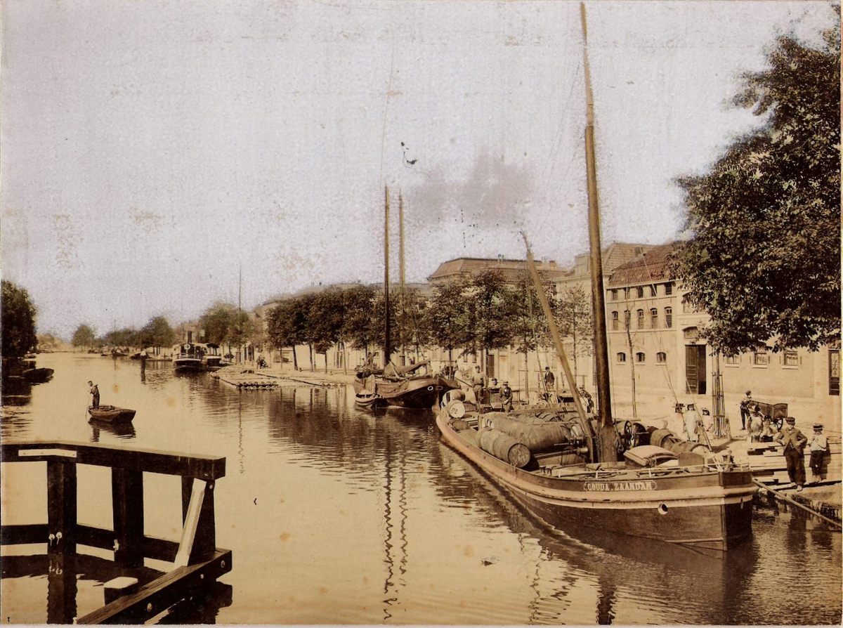 Gouda rond 1920. De 'Stad Gouda 2' in de Kattensingel bij het bolwerk. De man voorop is