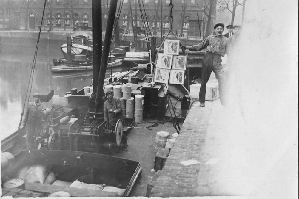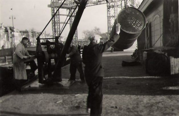 Het lossen van een vat met behulp van een walkraan. Rechts het gebouw van 'De Verenigde'.