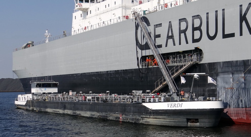 De bunkergiek is uitgerust met een trap, opdat men makkelijk aan boord van hoge zeeschepen kan komen.