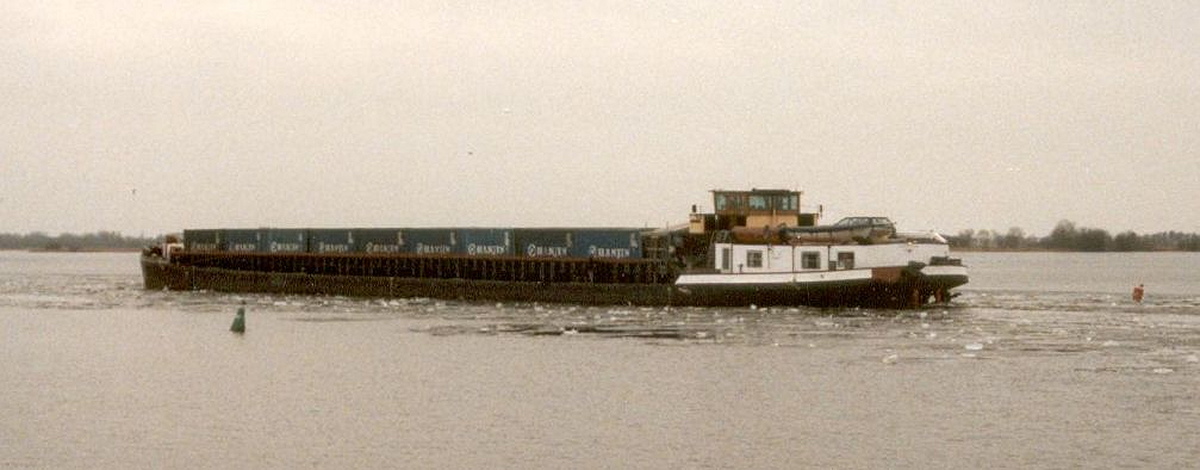 ruim opgestapeld. Het schip werd in 1958 bij Schimag, Mannheim (D) gebouwd voor Fendel Schiffahrts AG in Mannheim en kreeg toen de naam 'Fendel 89', mat 79,96 x 9,52 x 2,5 meter en had een laadvermogen van 1308 ton.