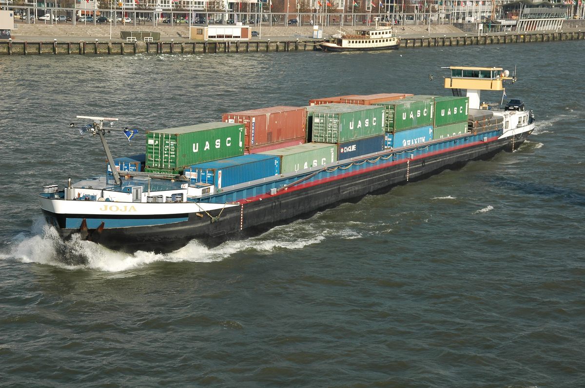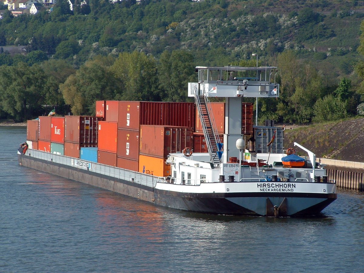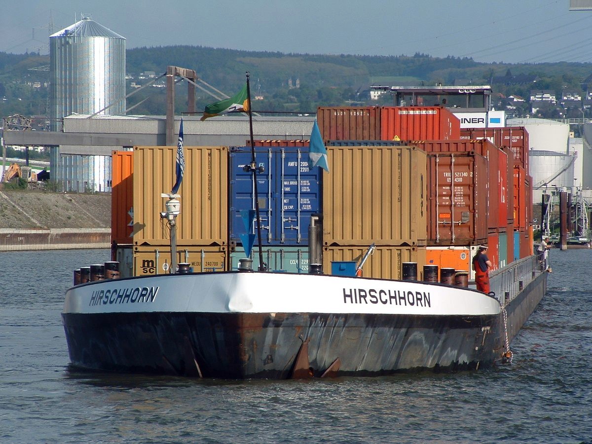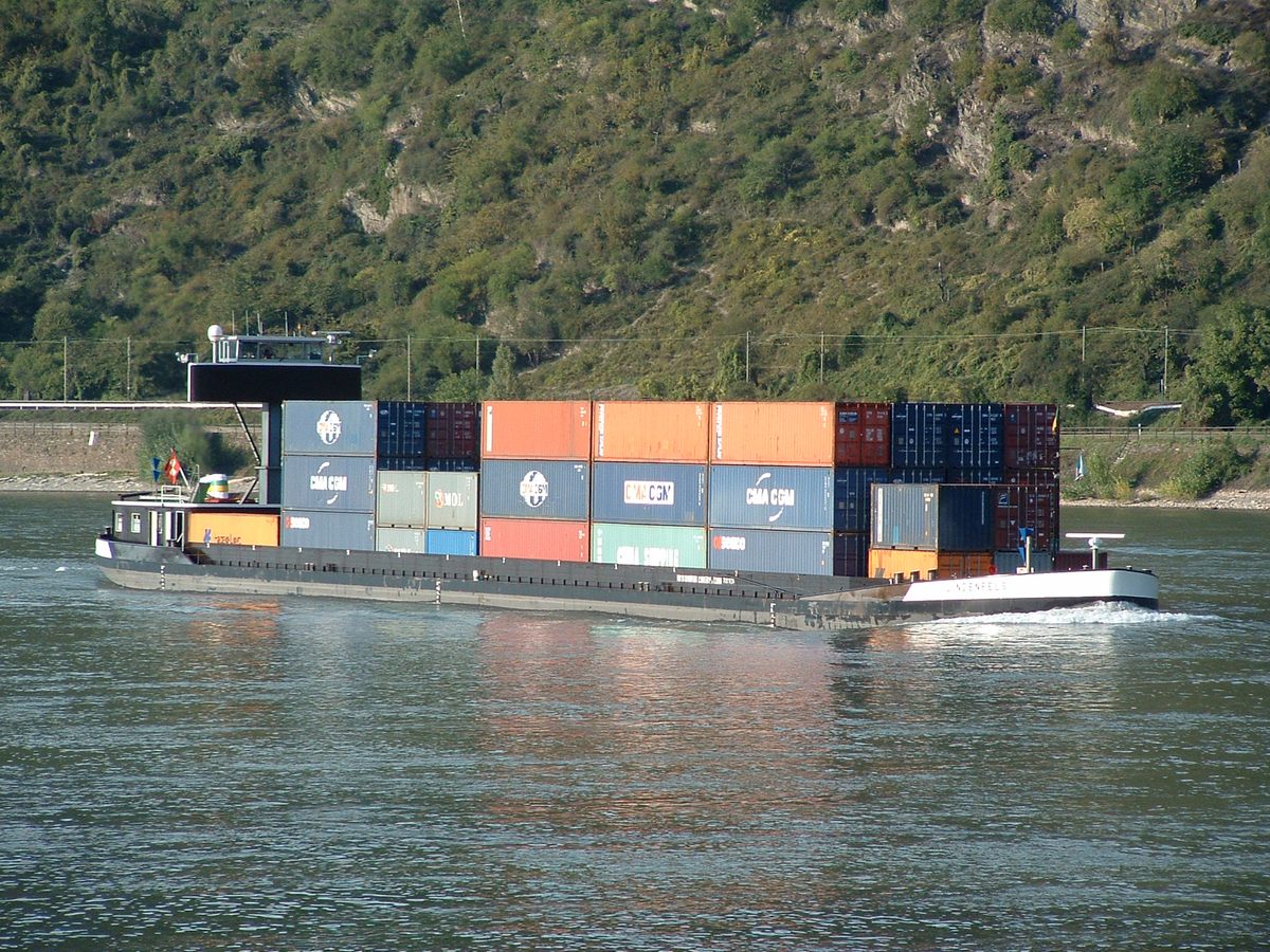 De 'Lindenfels' varend op de Rijn met een flinke lading containers. Daar containerschepen tijdens hun reis soms meerdere havens aan doen en in elke haven zowel containers