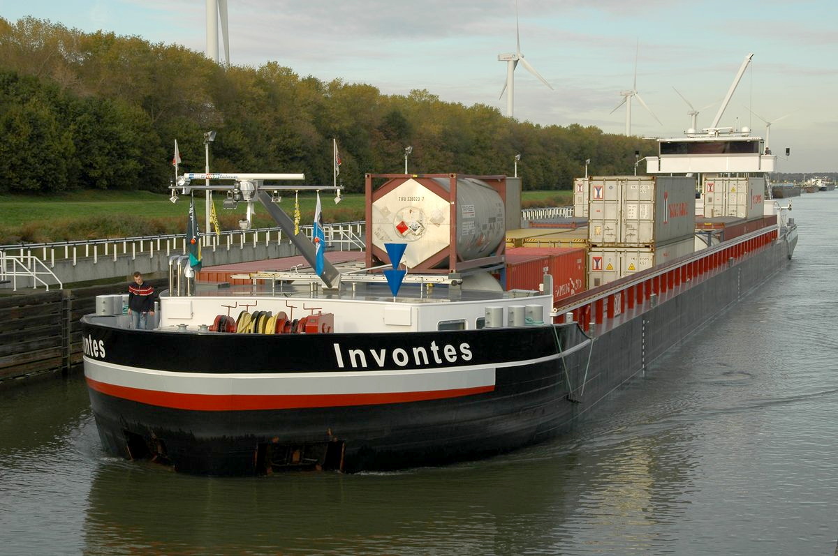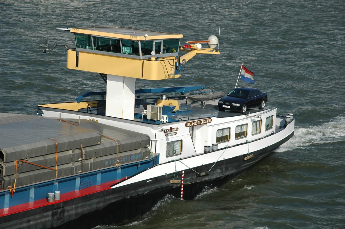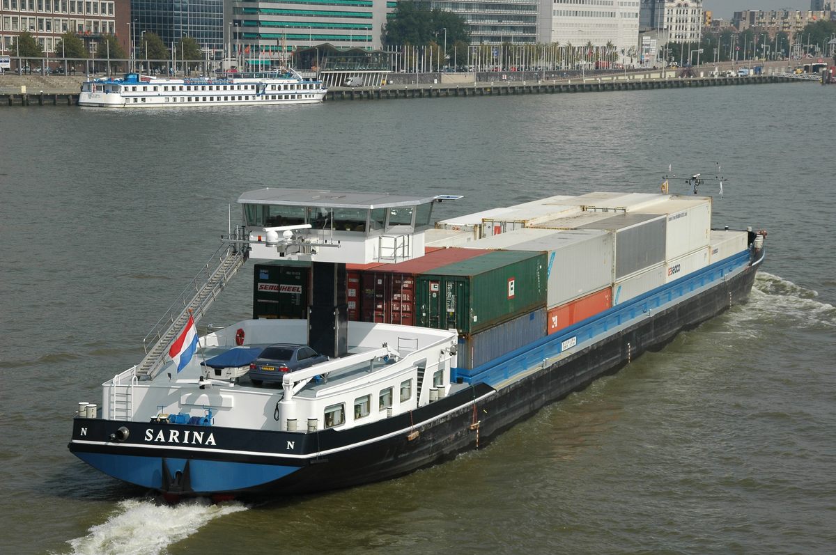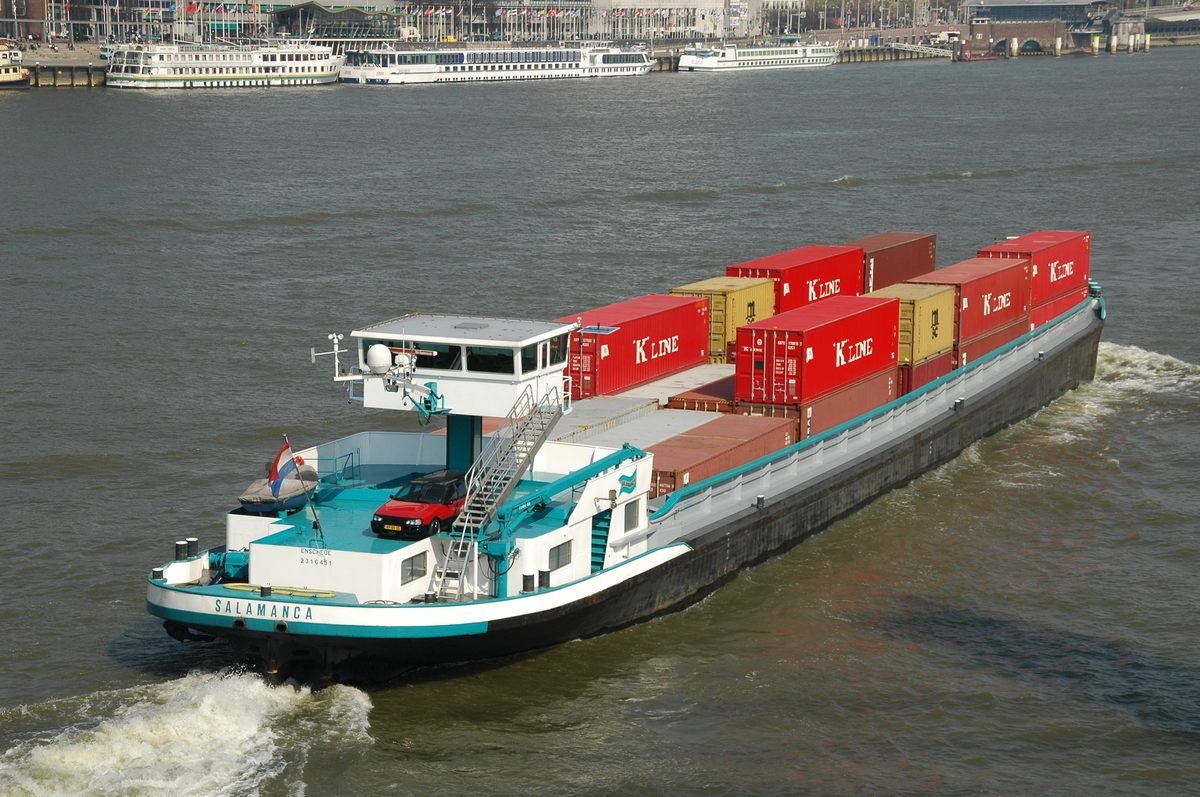 De 'Lindenfels' varend op de Rijn met een flinke lading containers. Daar containerschepen tijdens hun reis soms meerdere havens aan doen en in elke haven zowel containers