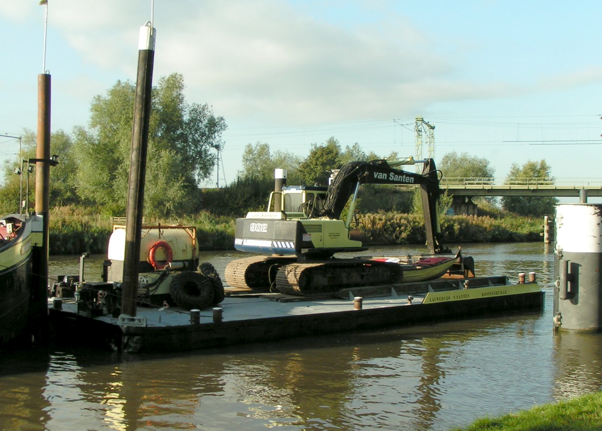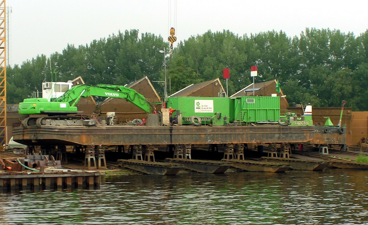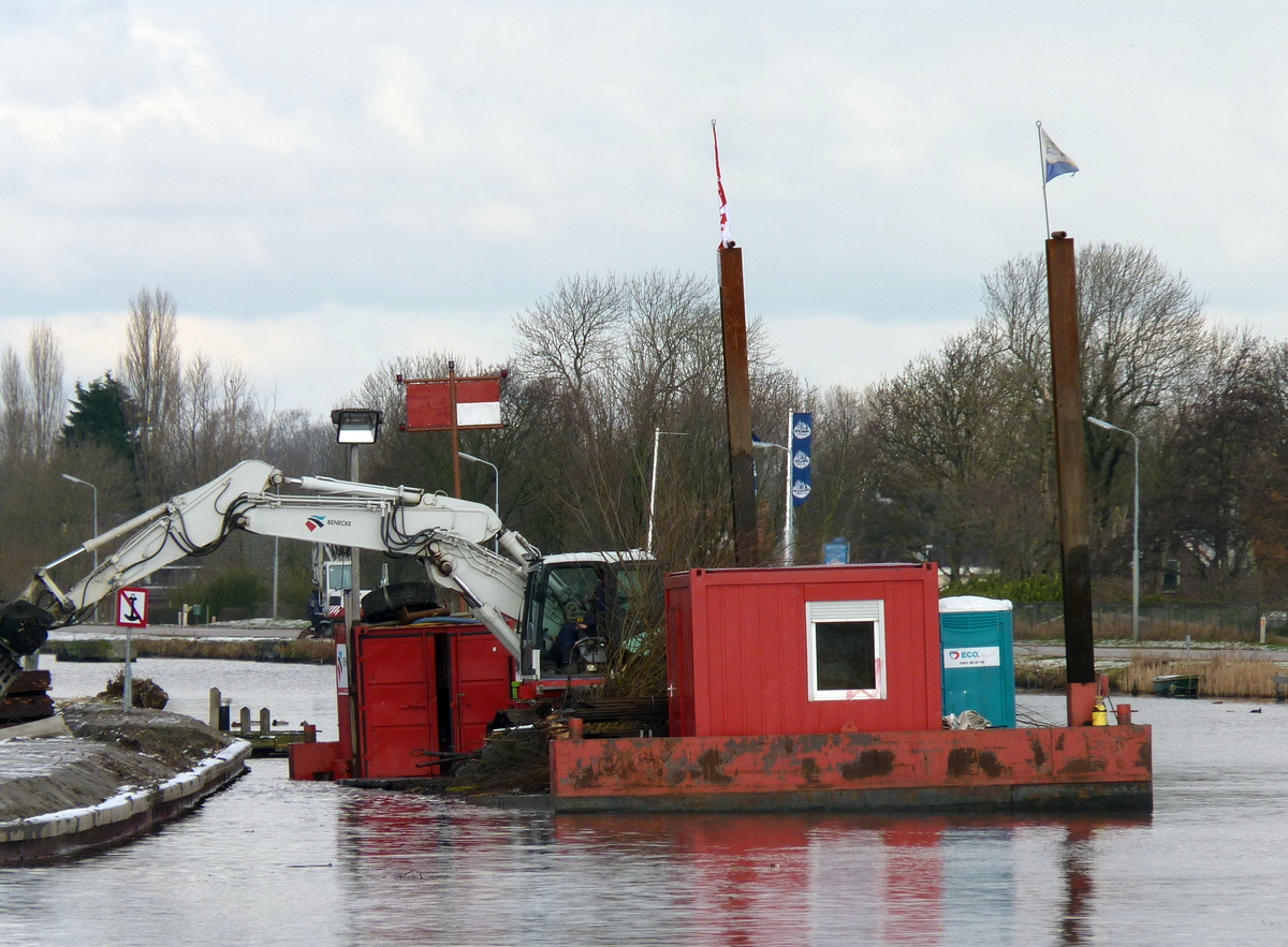 Nog een ponton bij een aannemer in de waterbouw bezig met het plaatsen van een nieuwe beschoeiing langs de ringvaart bij Haarlem.
