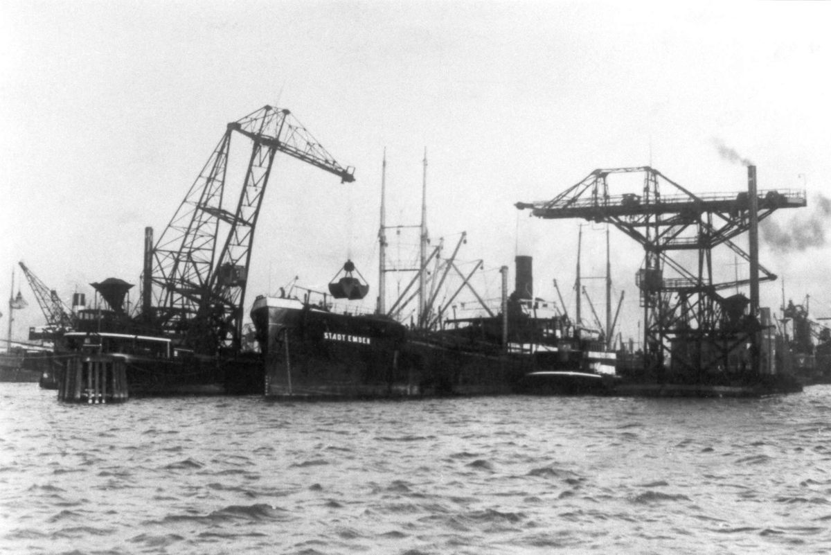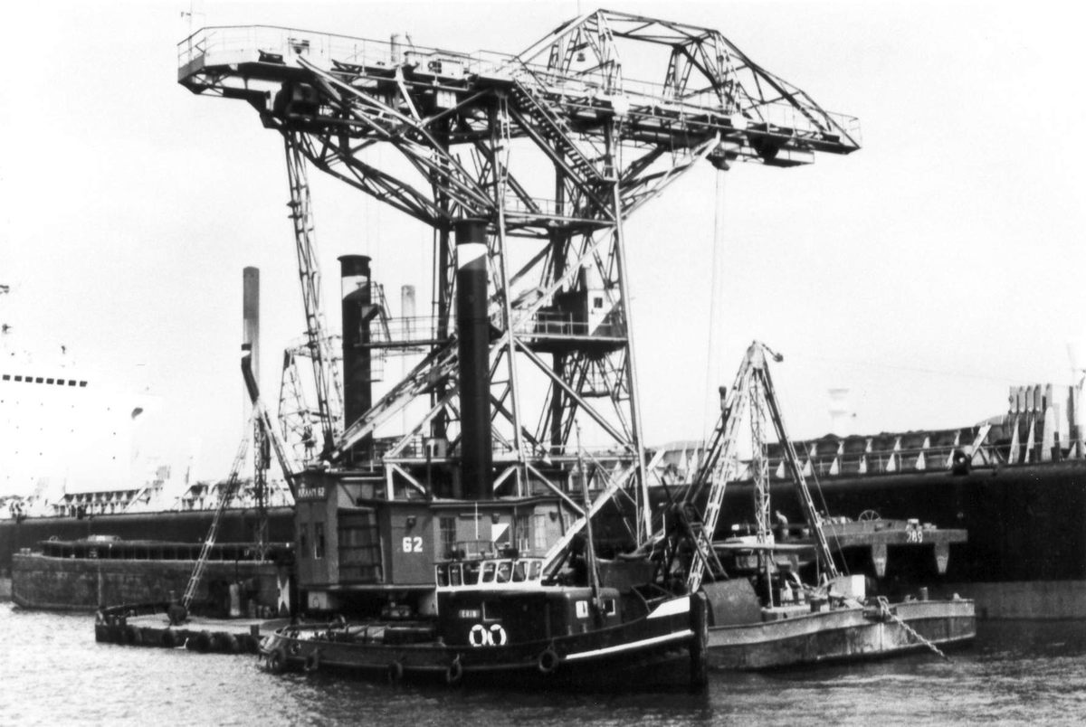 Overslag bij de Steenkolen Handels Vereeniging met twee verschillende drijvende kranen.