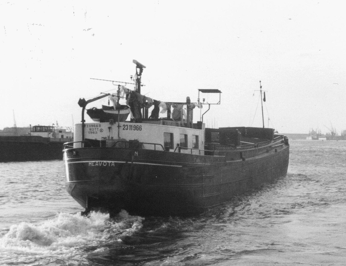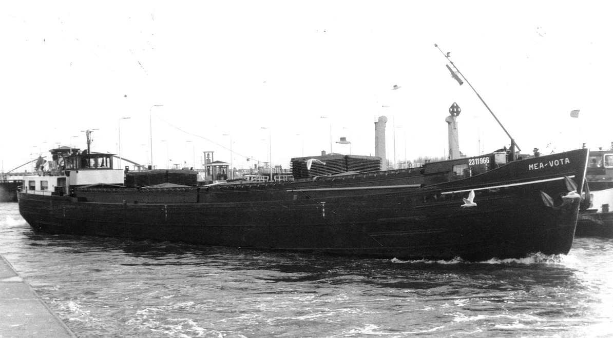 De 'Mea-Vota' bij vertrek uit de Oranje-Sluizen begeleid door een paar meeuwen. Dit schip, met een afgeronde steven is iets jonger dan de 'Be-An'. Het heeft nog wel een houten