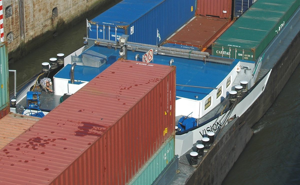 Het duwschip 'Vision' met daarvoor de gelijknamige 'bak'. Let op hoe de