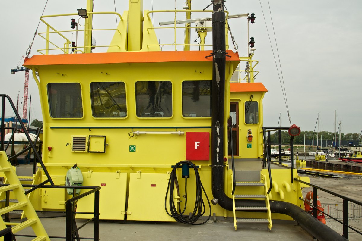 Gezicht op het stuurhuis. Op de voorgrond twee kunststofboeien,
