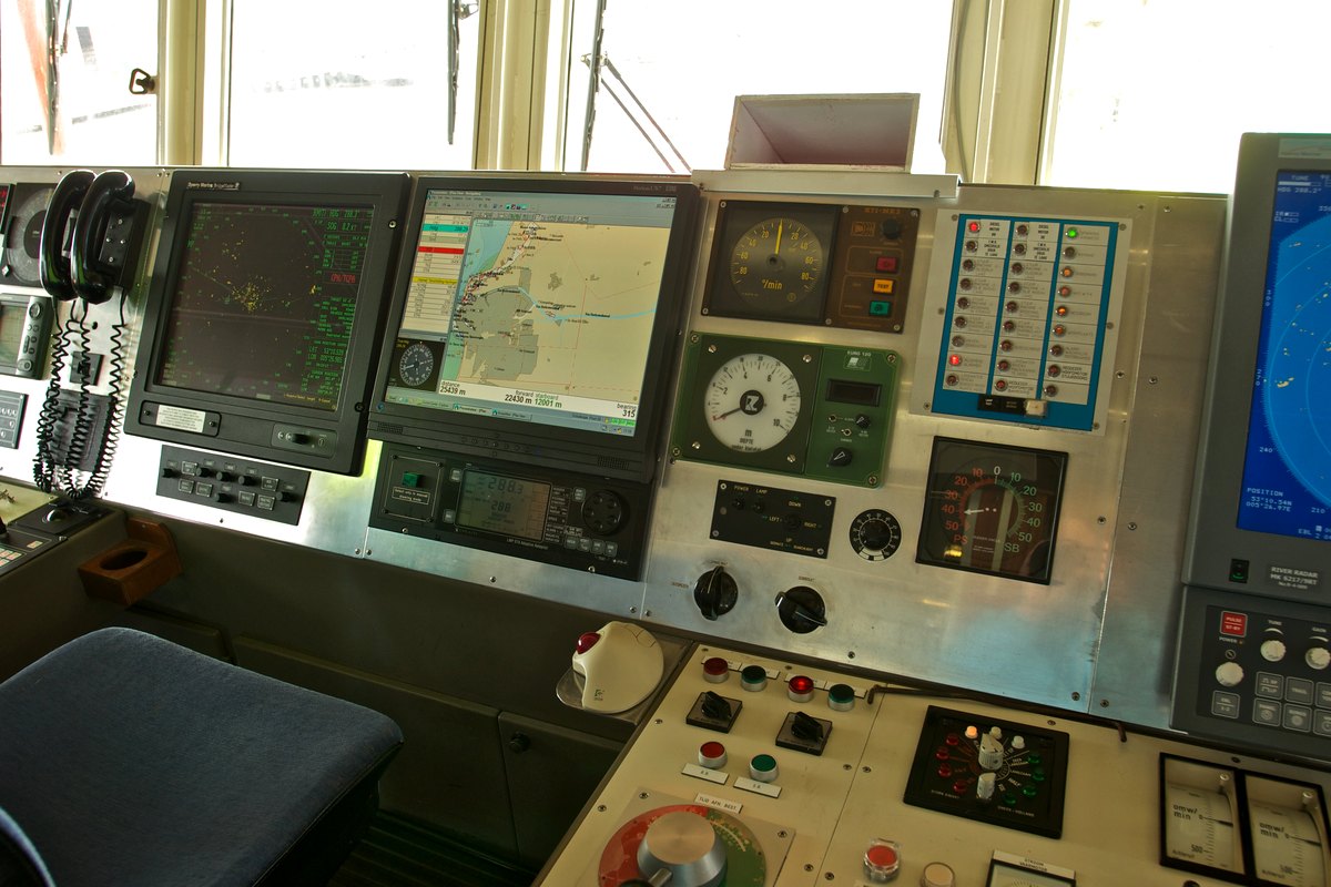 Links van de stuurstand een zitplaats voor een bemanningslid die naar ik denk als een soort van navigator opereert. Op het scherm een moderne electronische waterkaart.
