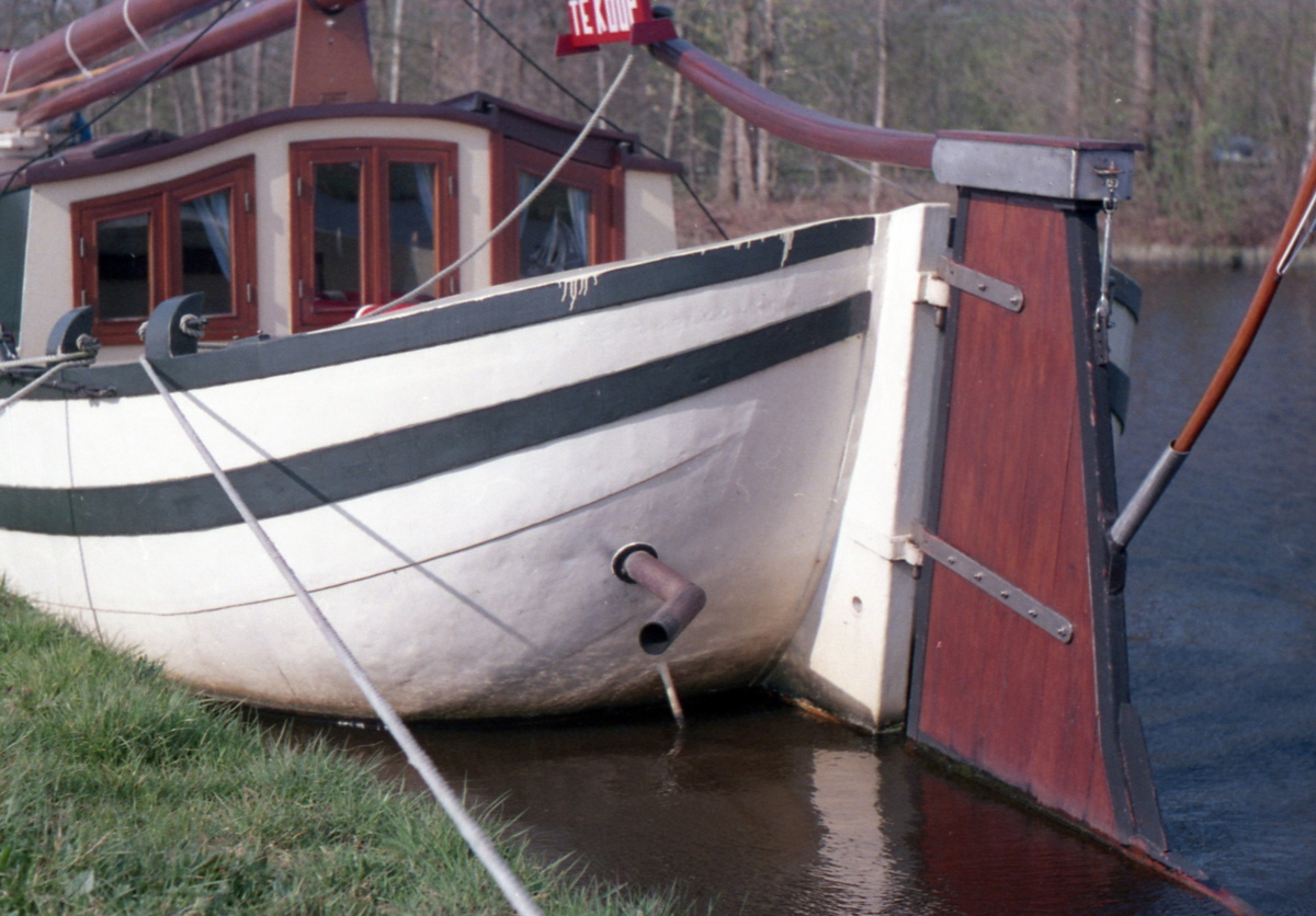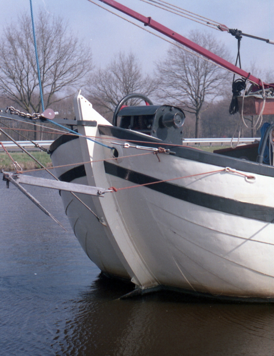 in de Drentse Hoofdvaart. Het scheepje is voorzien van een fraaie jachtenroef, die, zoals het hoort, bij de mast op houdt.