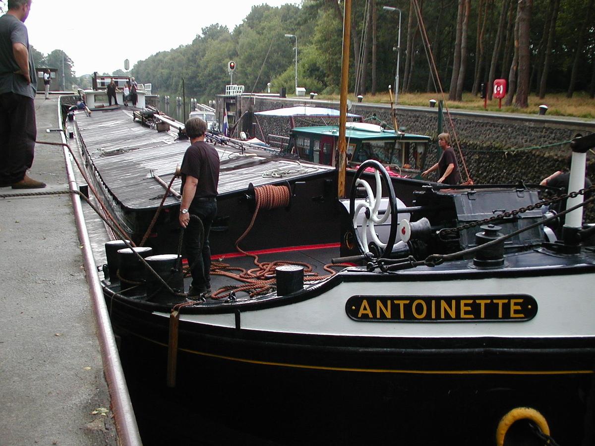 Sluis drie in het Wilhelmina kanaal. Doorgeschoven naar de tweede kolk van deze trapsluis. De nieuwe krachtbron ligt, als ik het goed zie, langszij gereed.