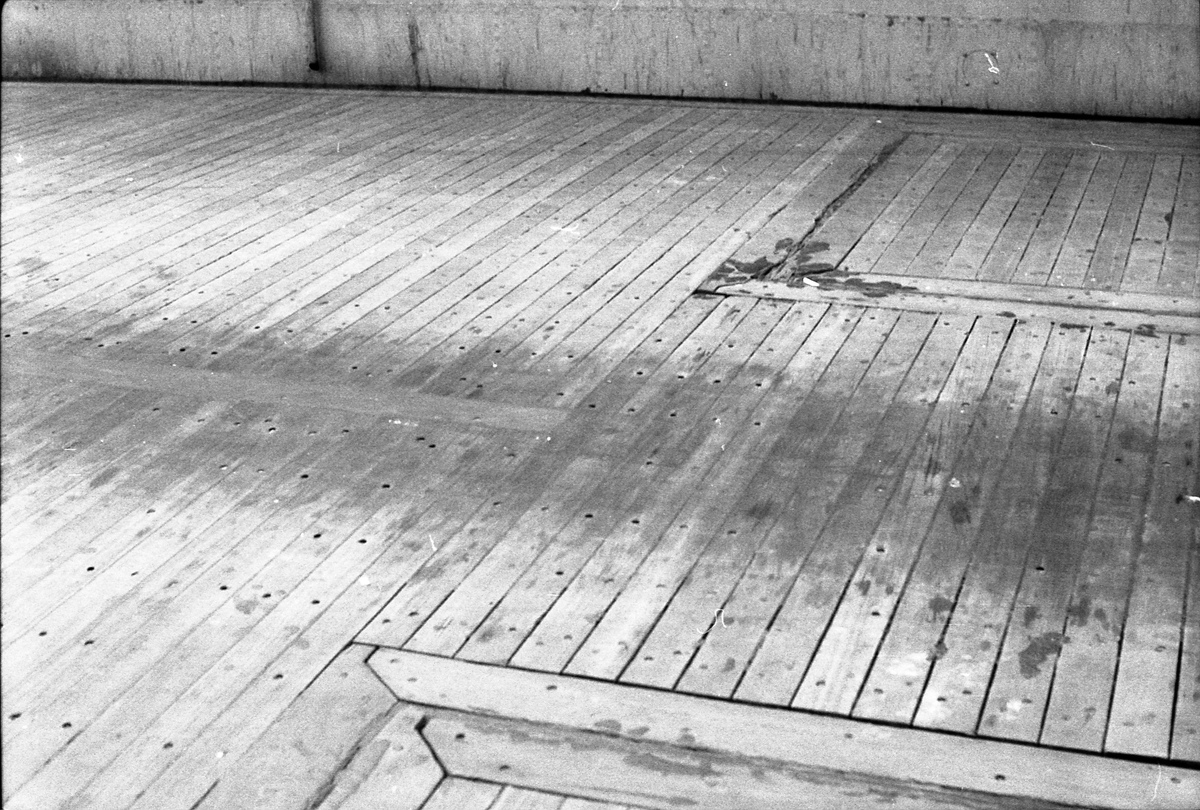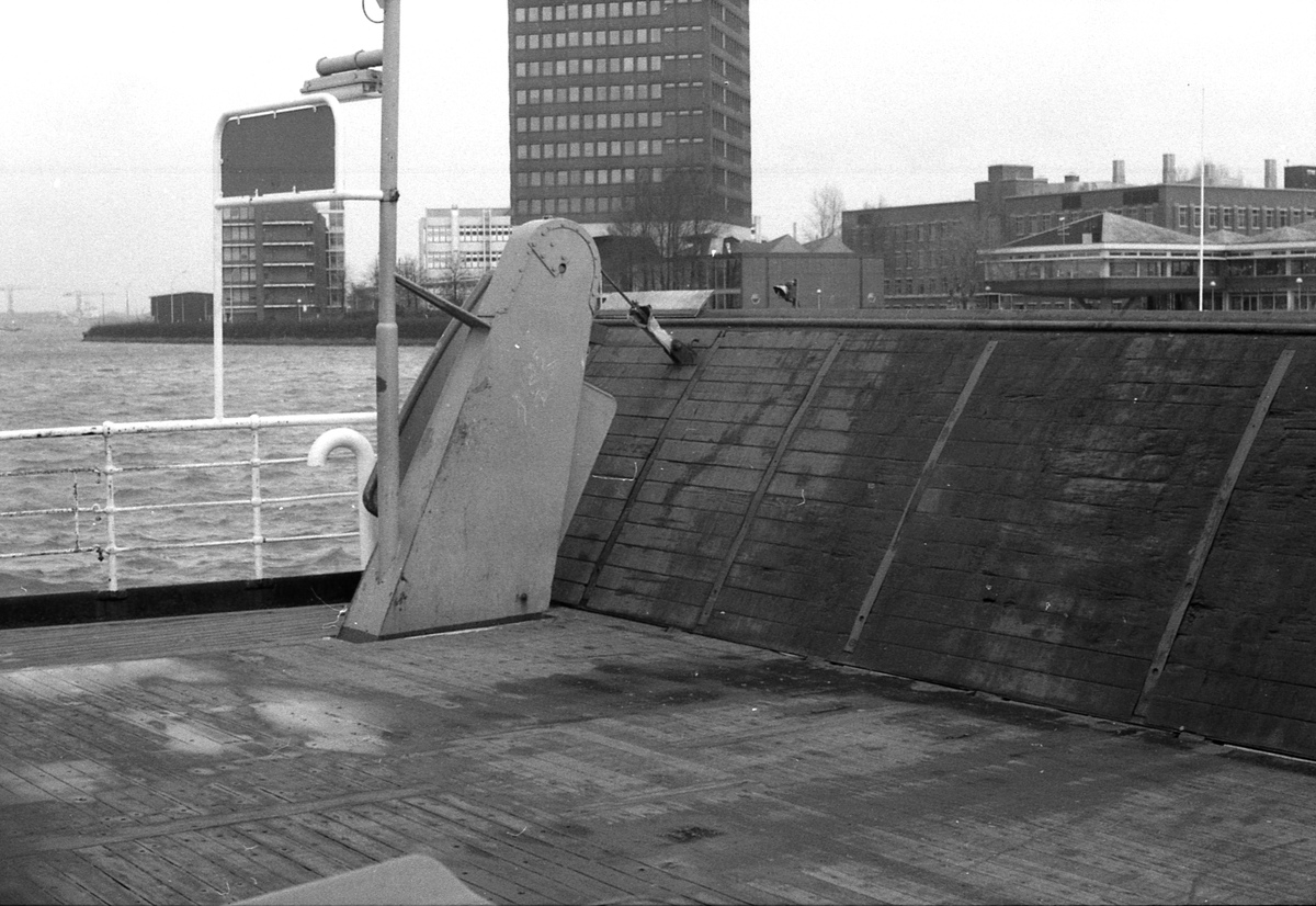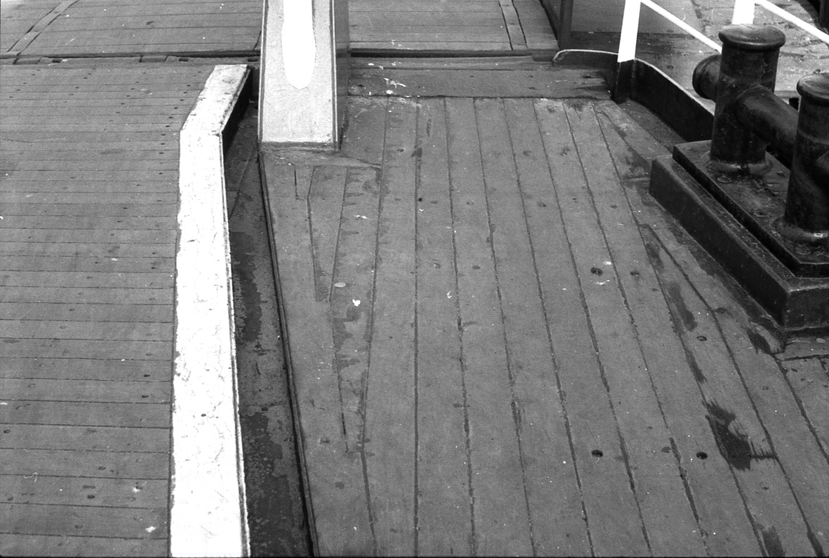 Links aan de reling het steuntje waarin de