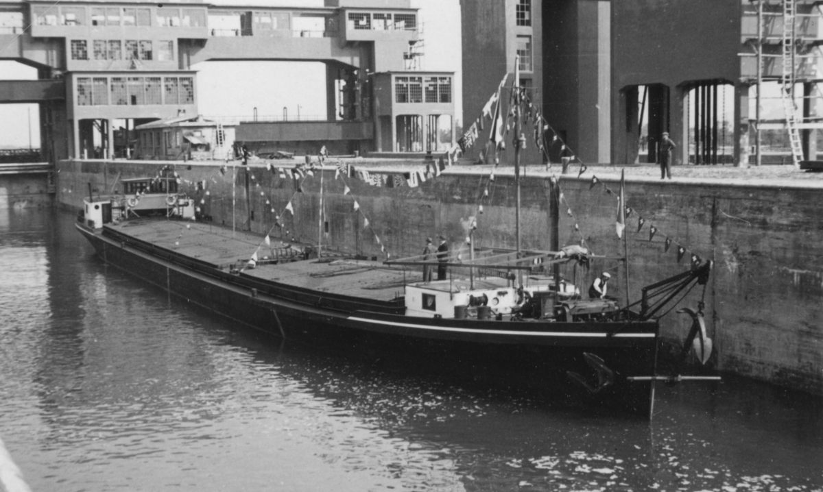 De gerepareerde 'Rhenus 127', als 'Grebbeland' in 1955. Het schip meet dan 79,95 x 9,47 x 2,67 meter en is 1167 ton groot. [
