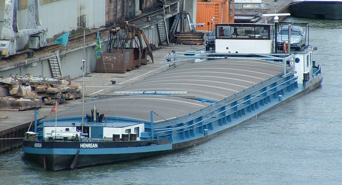 De 'Rhenus 125' op deze foto is een zusterschip van de 'Rhenus 127'. Het achterschip met zijn steile scherpe