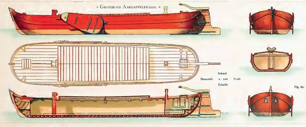 Het is op de foto moeilijk te zien wat nog origineel is en wat er aan het schip hersteld is. De stuiten, zoals hier aan het achterschip maken een strakke zware indruk. De stuiten lopen lang zo sterk niet op als bij de andere Spitse pramen.