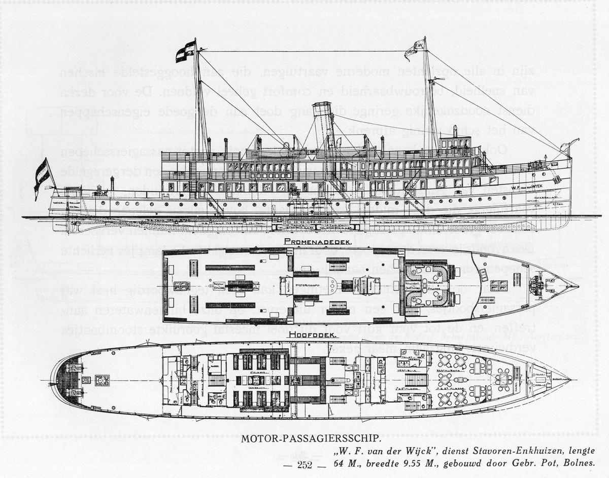 kruiphoogte bedraagt 5,7m. Voortstuwing: in eerste instantie 2x 40 pk Kromhout, in 1948 vervangen door 2x 80 pk GM en vervolgens 2x ca. 112 PK Scania. Het vaartuig kon als