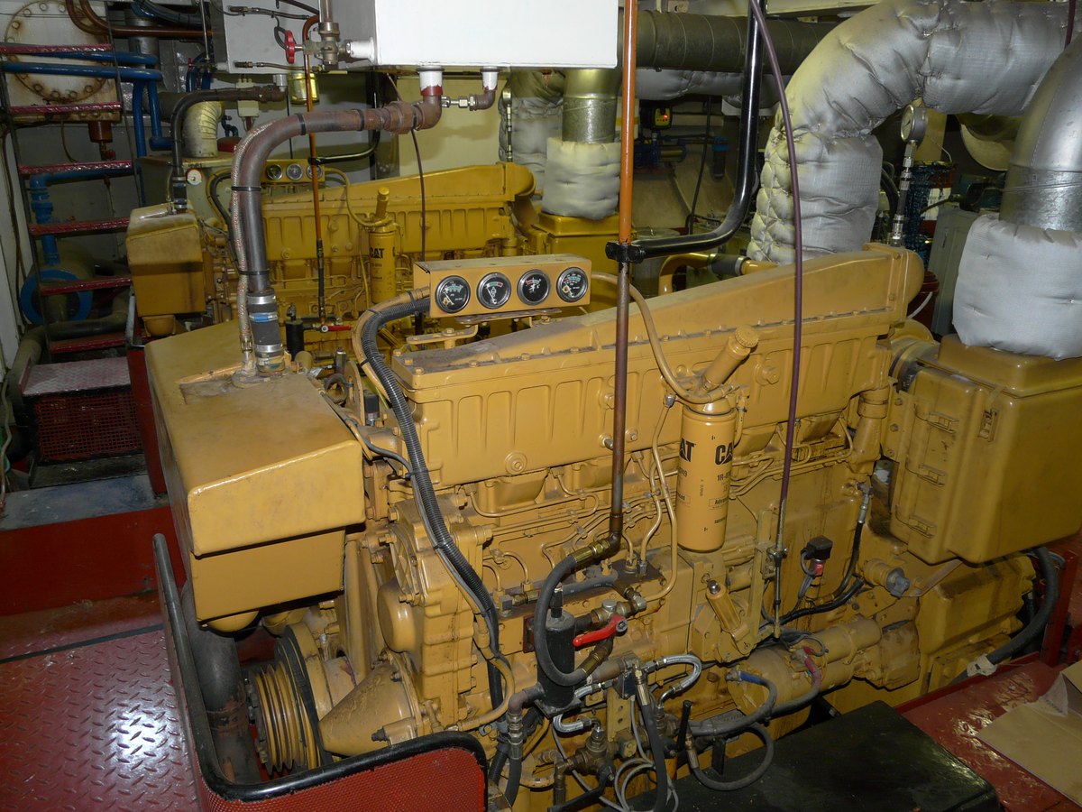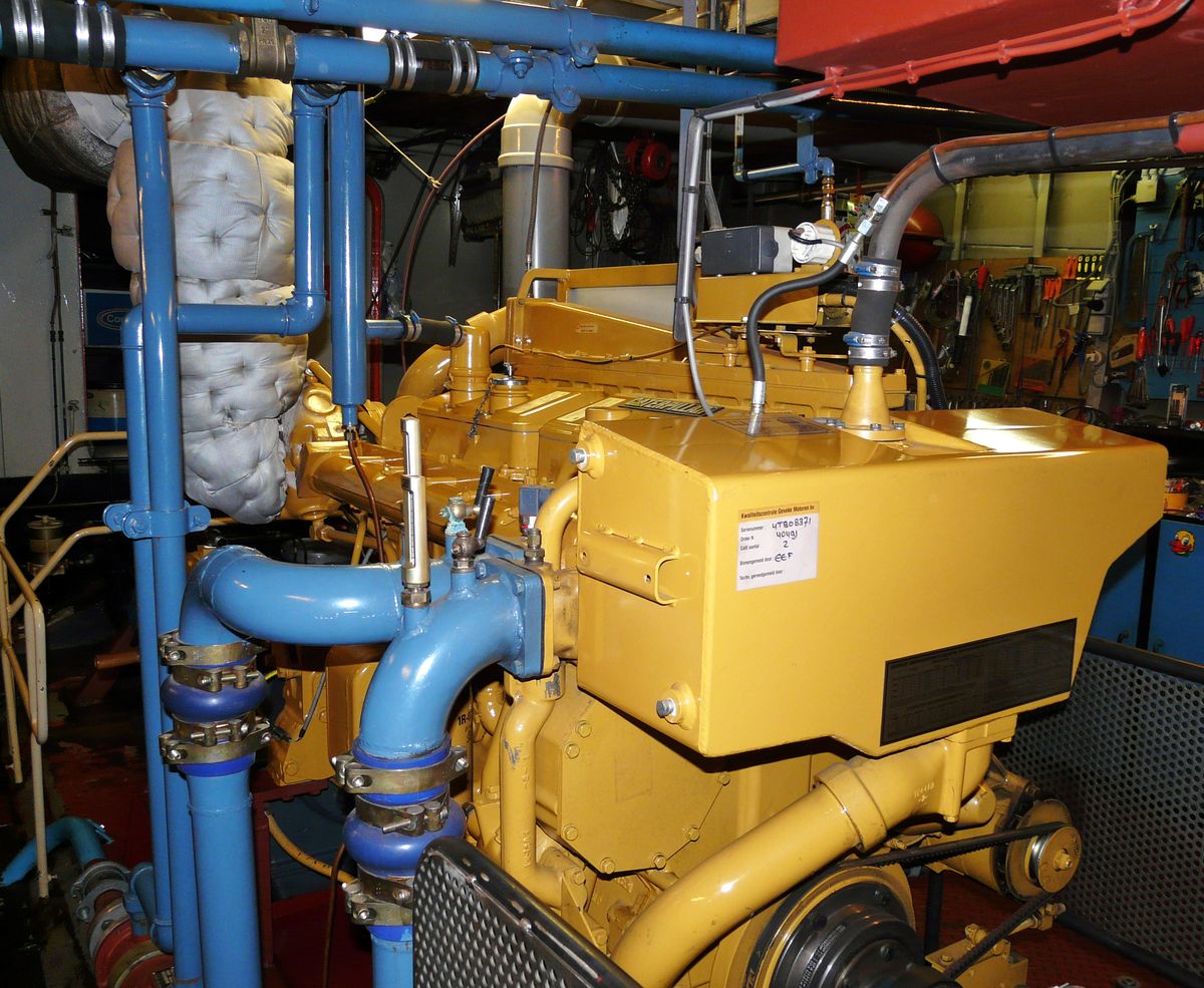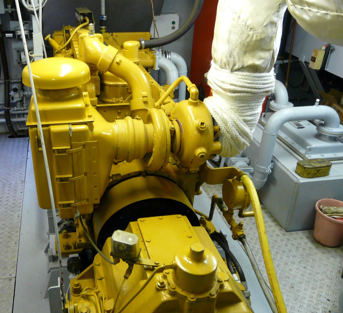 De stuurboordzijde is de uitlaatzijde van deze Caterpillar T3406. De motor maakt gebruik van drukvulling toch moet het uitlaatspruitstuk gekoeld zijn.