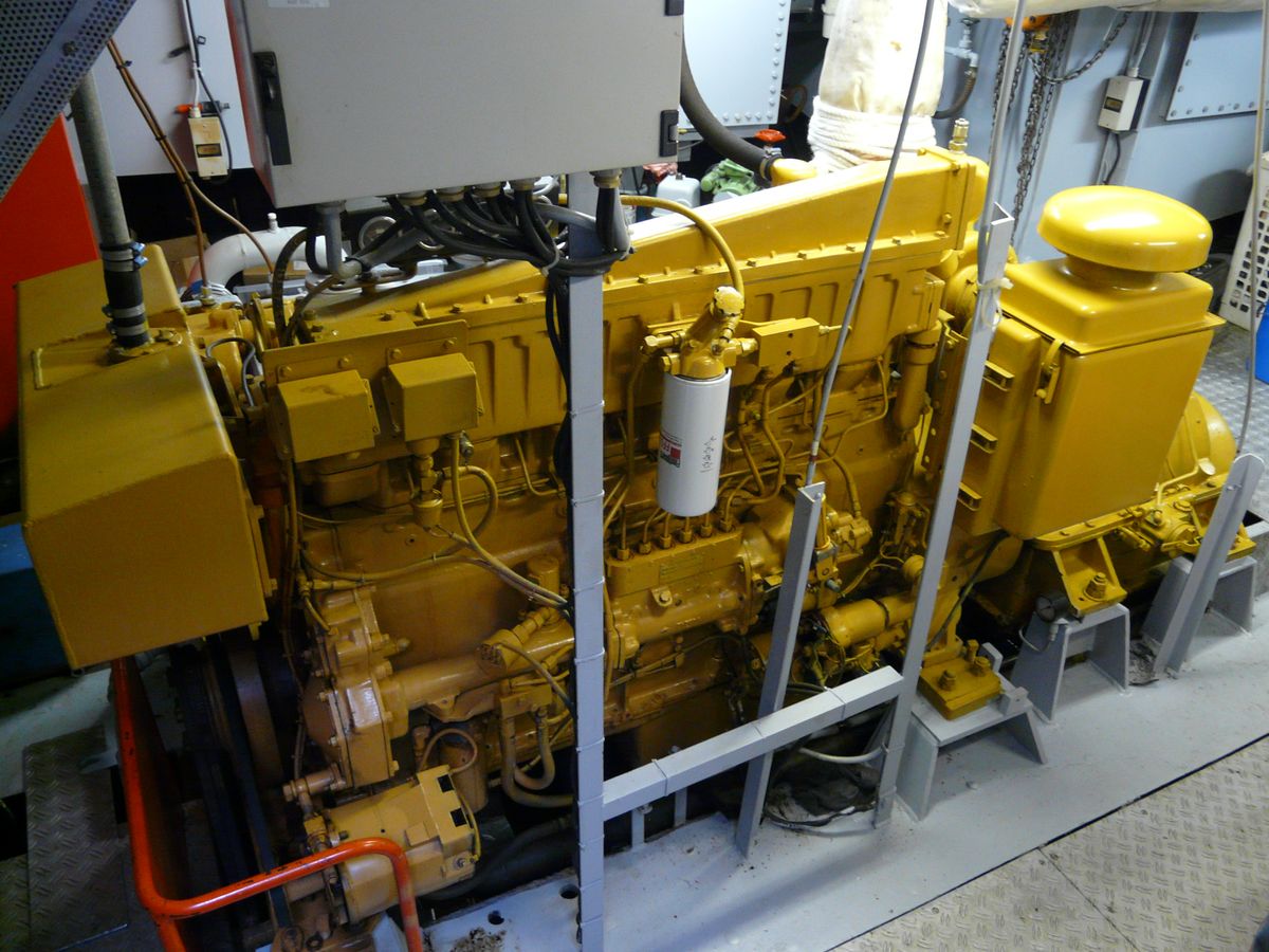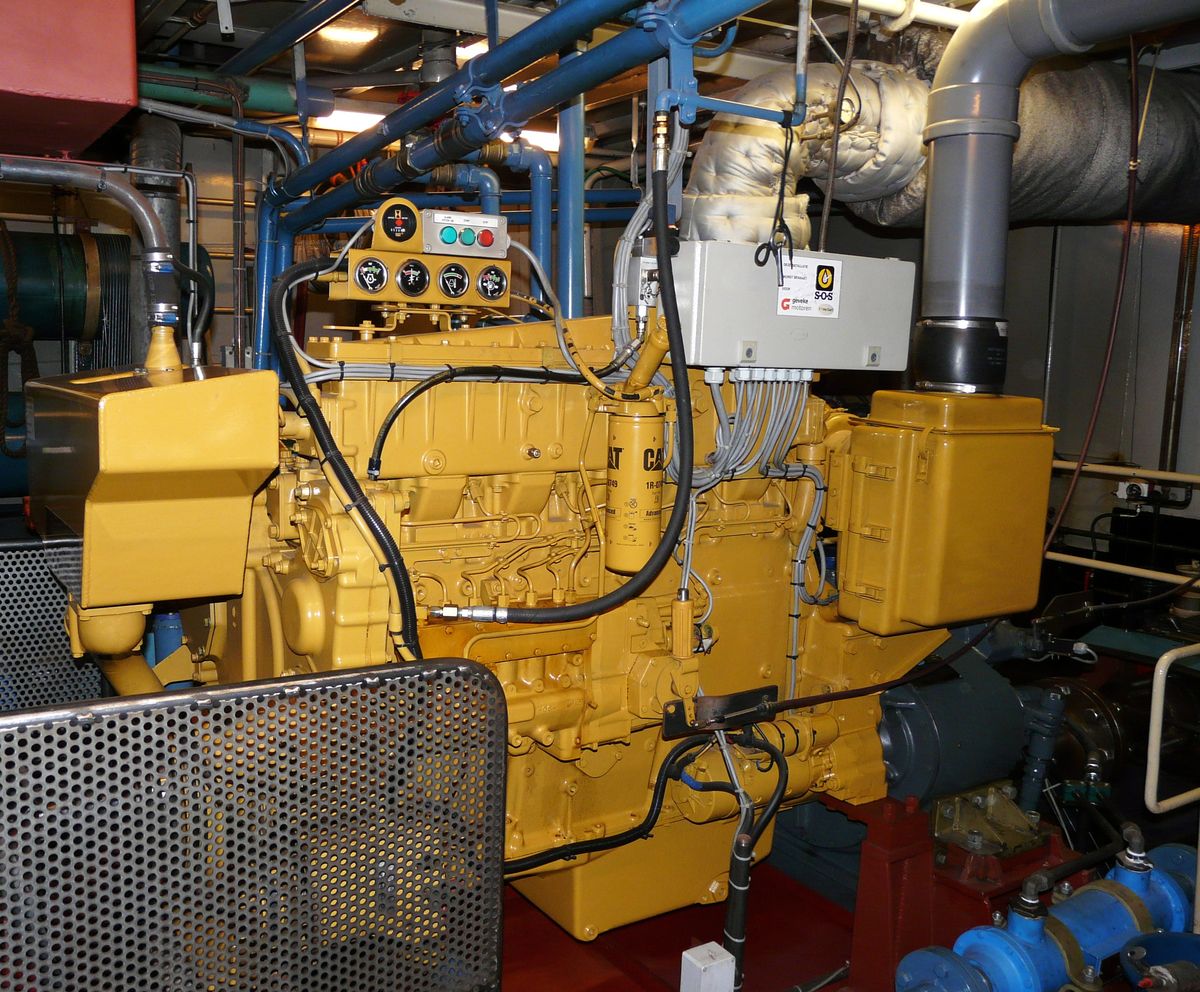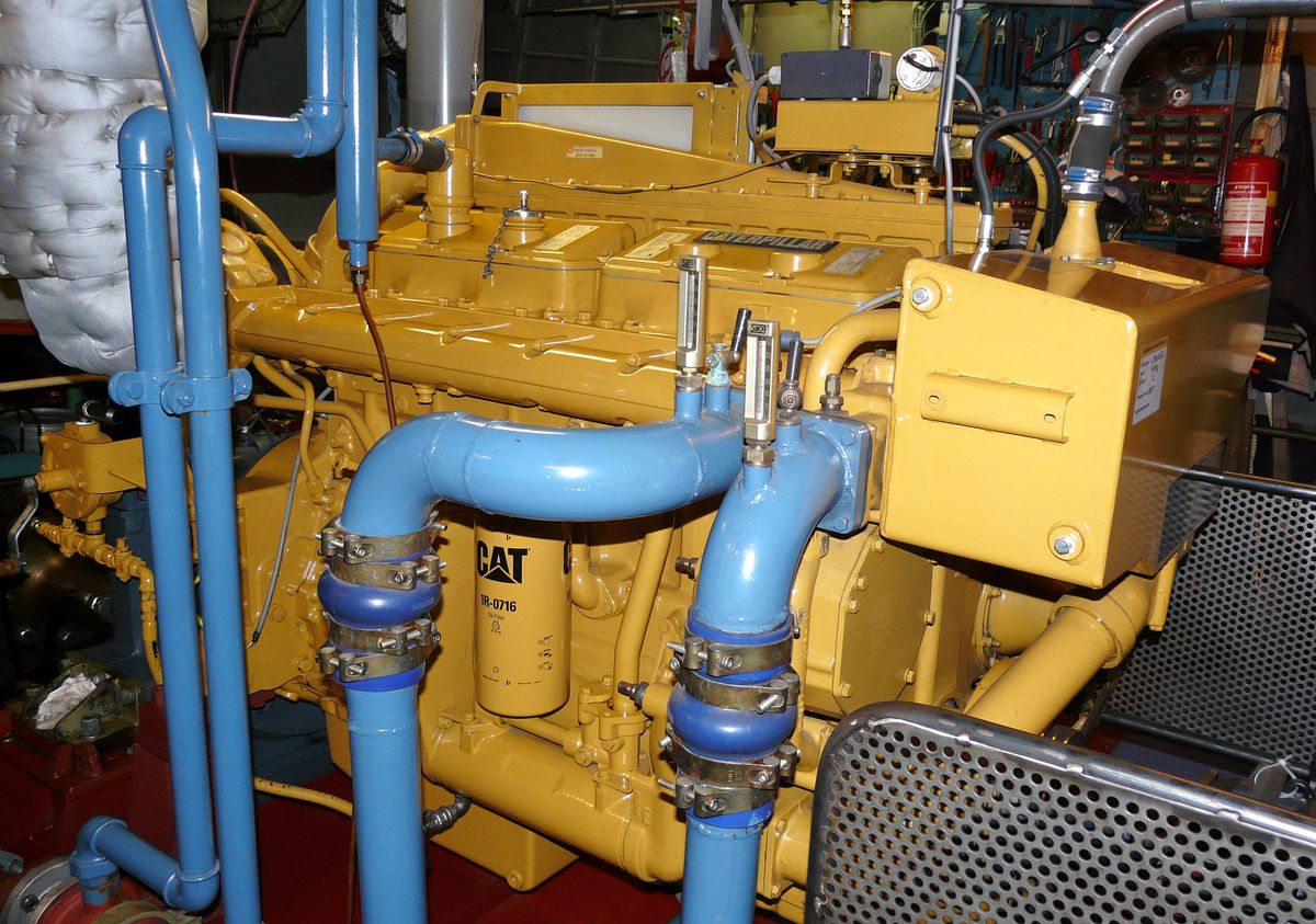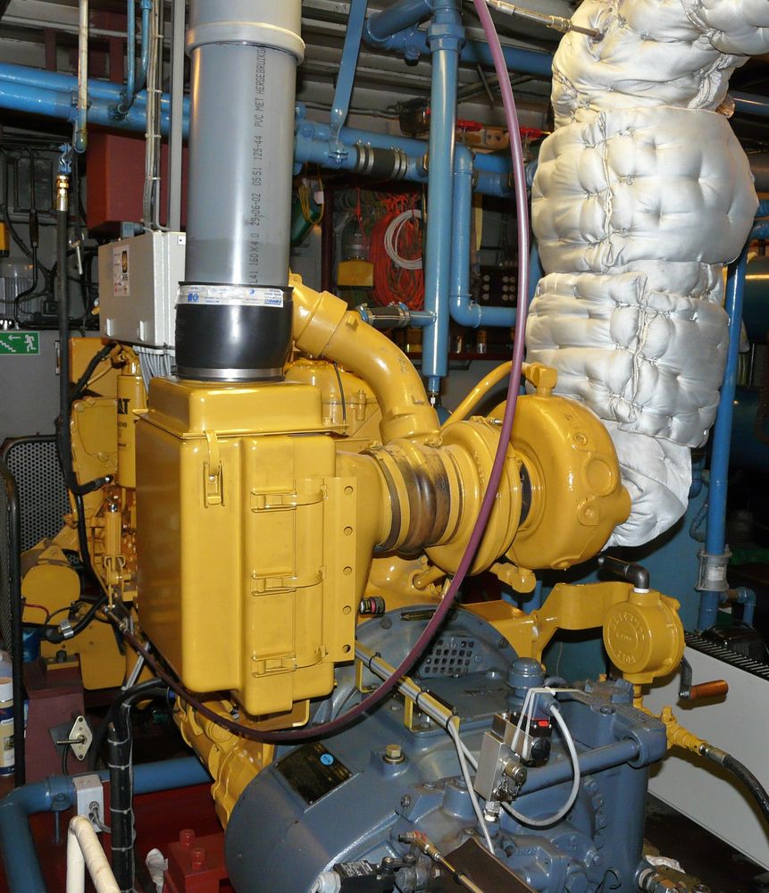 De stuurboordzijde is de uitlaatzijde van deze Caterpillar T3406. De motor maakt gebruik van drukvulling toch moet het uitlaatspruitstuk gekoeld zijn.