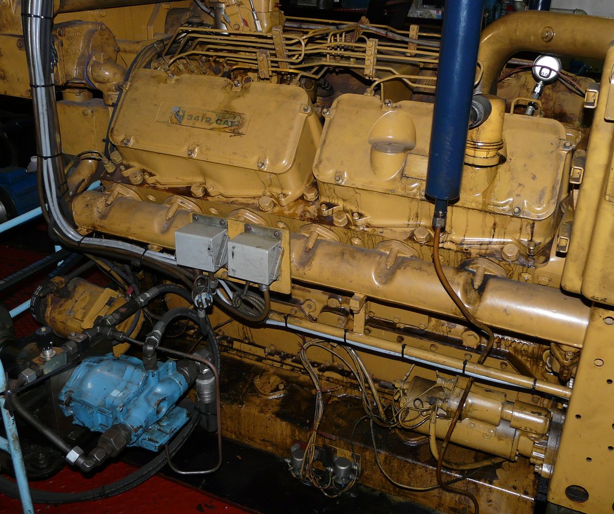 Op de voorgrond een handpomp, een impeller type?, voor zowel het voorpompen, als het 'aftappen' van de smeerolie.