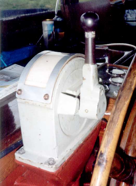 Onder deze hendel (2) was een verticaal kijkglas met een mechanische wijzer die werd aangedreven door een wormwiel op de verticale regulateur as. Deze wijzer kon ongeveer 10 cm in hoogte verschuiven. Met deze regulateur kun je heel nauwkeurig het toerental instellen. Tussen 120 (stationair) en 515 (100 + 10%) toeren. Daarvoor moest je de regulateur 6 of 7 slagen ronddraaien. Je kon dus altijd de motor zo afstellen dat je weinig trillingen had. Opvarend voeren we altijd met de regulateur vol open minus 3/4 slag. Dan draaiden we 480 toeren. Ik draaide deze regulateur met mijn wijsvinger.
