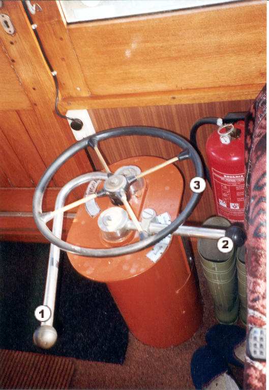 - Deze console is ontworpen om tegen het voorschot van de stuurhut te staan. De gebogen stang (1) heeft maar twee standen en hoort in de stand VORAUS evenwijdig aan de voorkant van de stuurhut te lopen. In de stand ZURÜCK, wijst hij dan 45 graden naar achteren. Hij is gebogen zodat hij dan precies om de as van de korte hendel heen valt. De korte handel (2) had van links naar rechts drie standen START, STOP, BETRIEB. Vanuit STOP bewoog je de hendel naar links in de stand START en ging de motor op samengeperste lucht (van 12-30 bar) draaien. Zodra er beweging in de motor zat, schakelde je met een vloeiende beweging door de middenstand heen naar BETRIEB en dan nam de brandstofpomp de motor over. Het omkeren van de draairichting kon alleen in de STOP-stand, maar je hoefde niet veel kracht te zetten, want de pneumatiek deed het werk.