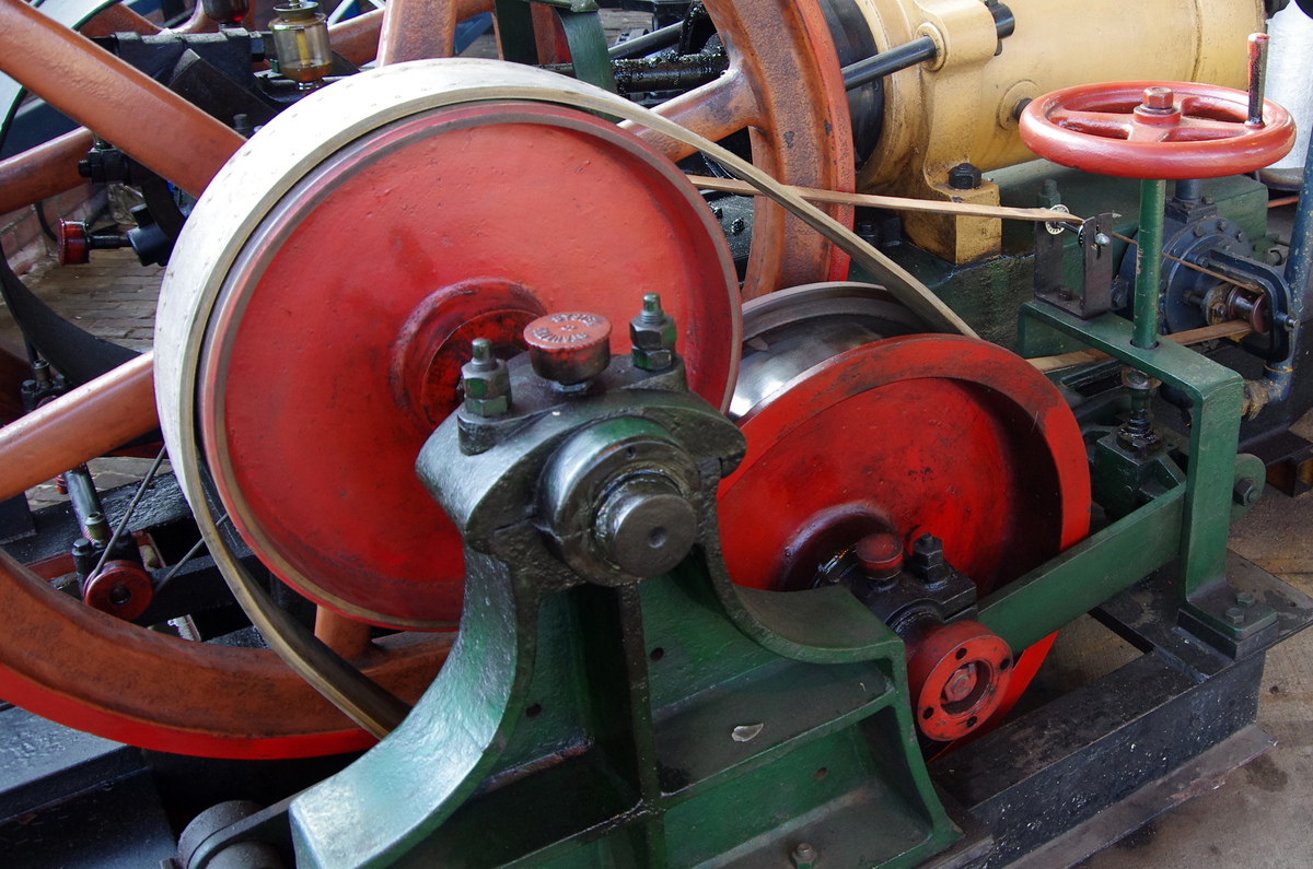 De motor is onder meer bekend van wege zijn omkeerbeweging. Het onderste drijfwiel rust op een juk (bij de rode pijl) dat
