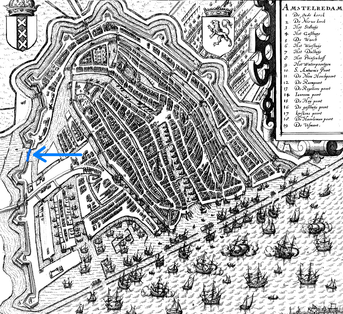 Binnen de wallen zijn echter wel de nodige ophaalbruggen en bruggen met oorgaten gekomen, maar de Blaeuwe Brugh strooit dus roet in het eten. Ook door de vestinggracht om de wallen heen varen lukt niet vanwege de St Anthonisdijk en de Steenen Beer bij de Haarlemmerpoort.