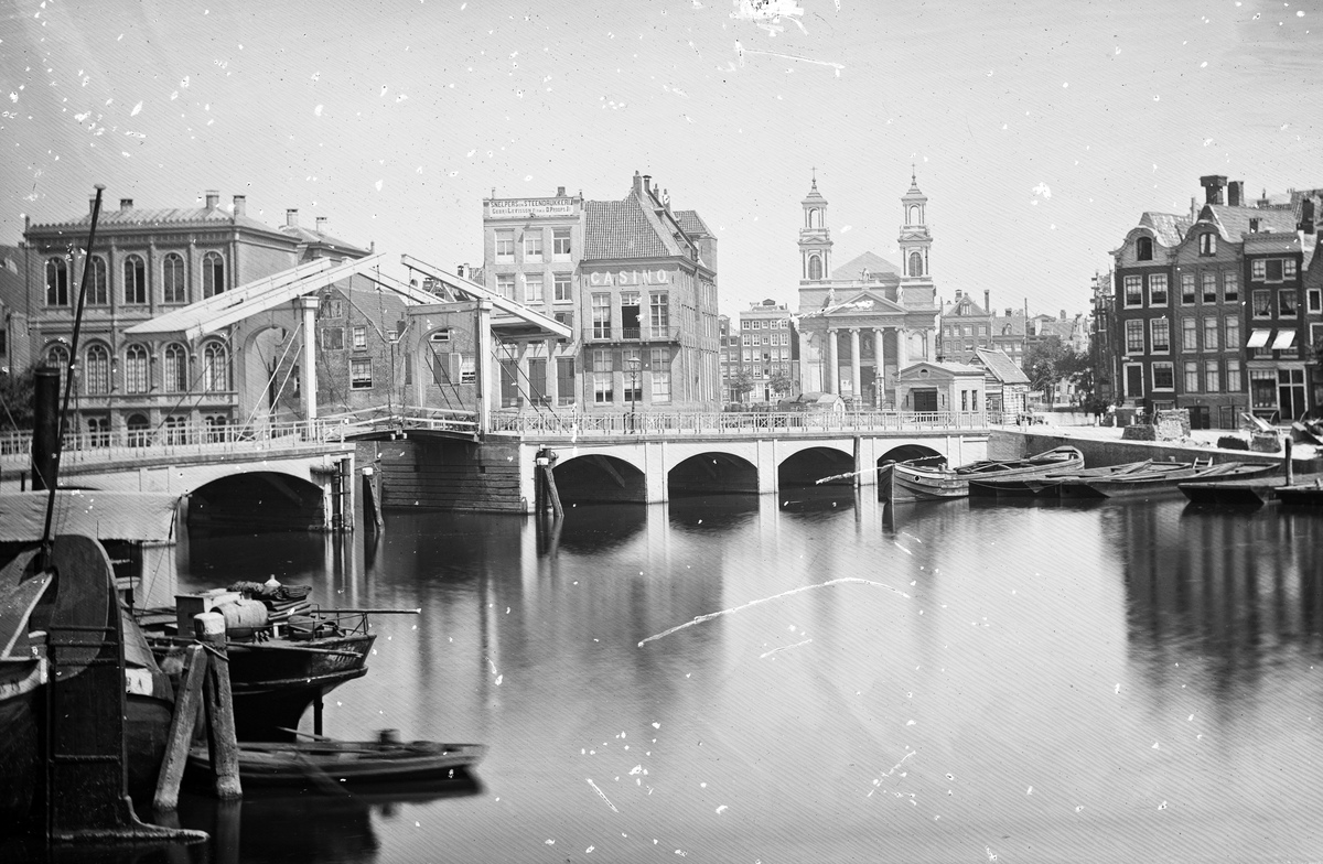 De Blauwbrug in 1873. Op de achtergrond de Mozes en Aäronkerk