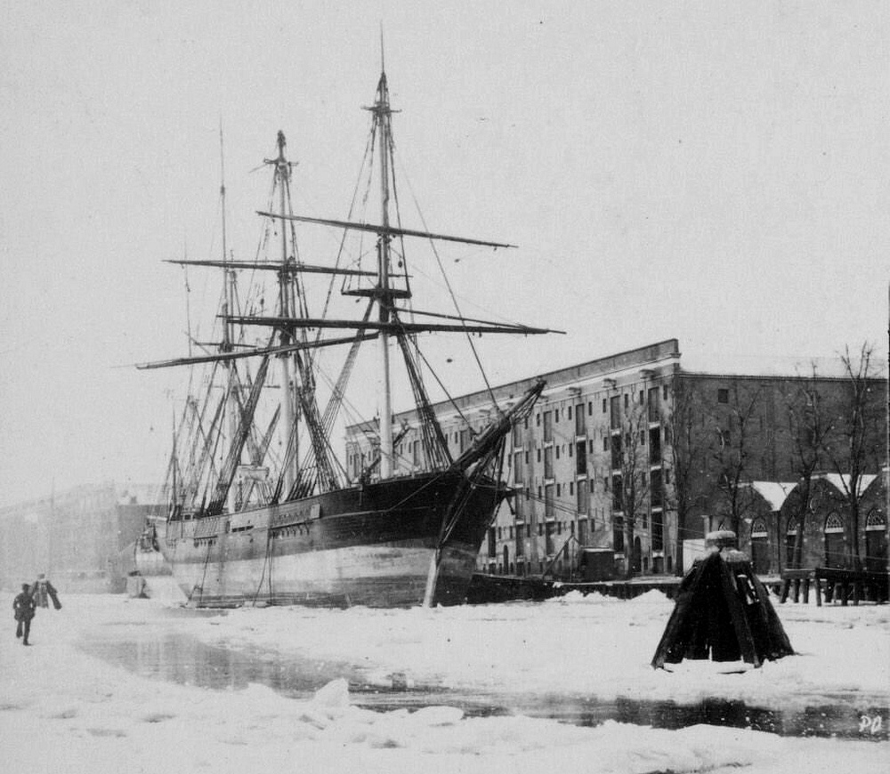 Een forse houten driemaster, rond 1862, opgelegd ter overwintering in het Entrepôtdok.