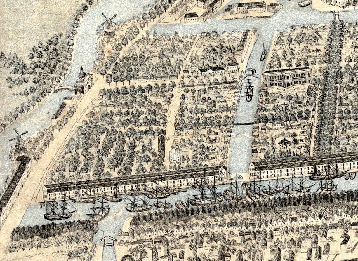 Het Entrepôtdok in 1832 zoals getekend door Petrus Josephus Lutgers. De gracht lijkt me een beetje te breed uitgevallen. (Deze was ca. 60 meter.) Na de eerste rij pakhuizen links, zou de invaart naar de Nieuwe Prinsengracht moeten liggen. Een beetje lastige in- en uitvaart zo te zien.